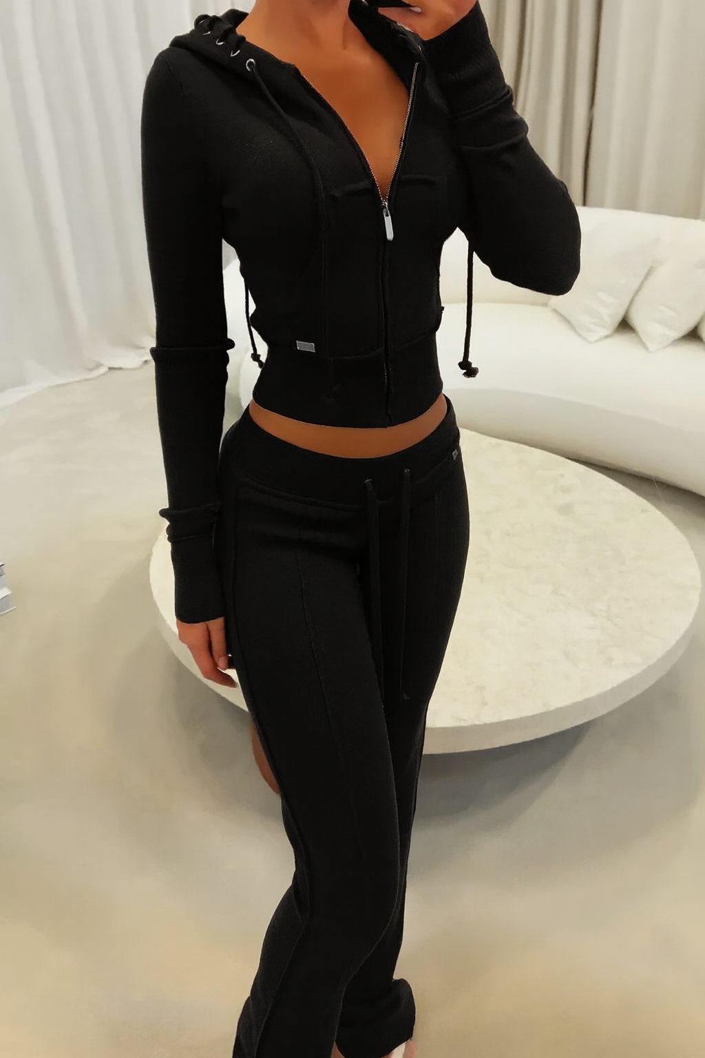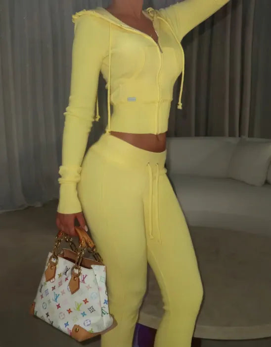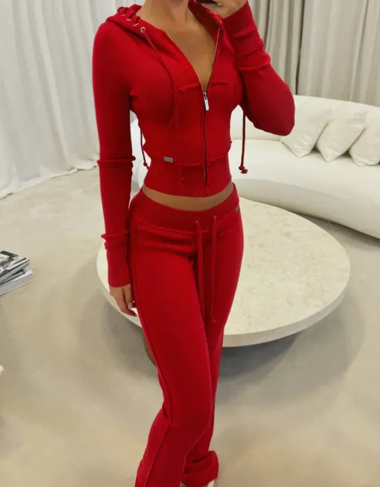 La veste courte zippée à capuche apporte une touche sportive chic, tandis que le pantalon taille haute allonge subtilement la silhouette.